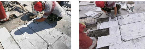通過現(xiàn)場試鋪段得知,水泥和砂的質(zhì)量比在1:5~1:7時(shí),其粘結(jié)力和透水性能達(dá)到最佳。因此,采用質(zhì)量比為1:5的“干硬性”水泥中砂做找平層,厚度為2.5cm。施工過程中需確保找平層的平整度,坡度符合設(shè)計(jì)要求。按放線高程在方格內(nèi)按線和標(biāo)準(zhǔn)縫寬砌第一行樣板磚,然后以此掛縱、橫線,縱線不動,橫線平移,以此按線及樣板磚砌筑。直線段縱線應(yīng)向遠(yuǎn)處延伸,以保持縱縫直順;曲線段可砌筑成扇形。鋪筑施工時(shí),磚要輕放,并用木槌或膠槌輕擊磚的中心,不得向磚底塞灰或支墊硬料,必須使磚穩(wěn)定平鋪在滿實(shí)的砂漿上,無任何空隙;應(yīng)隨時(shí)用水準(zhǔn)尺檢驗(yàn)平整度,出現(xiàn)問題及時(shí)修整;同時(shí),應(yīng)避免與側(cè)石出現(xiàn)空隙,如有空隙應(yīng)調(diào)整均分縫寬,或移在構(gòu)筑物一側(cè)。當(dāng)構(gòu)筑物一側(cè)及井邊出現(xiàn)空隙可用切割磚填平,必要時(shí)也可用細(xì)石混凝土補(bǔ)齊并刻與花磚相仿的縫,以保持美觀。